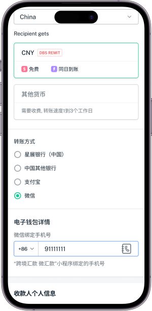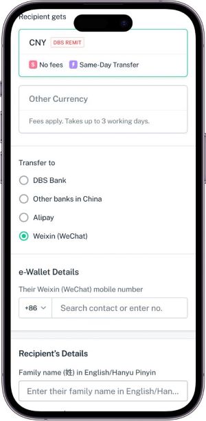 DBS Remit transfer to Weixin Pay.
