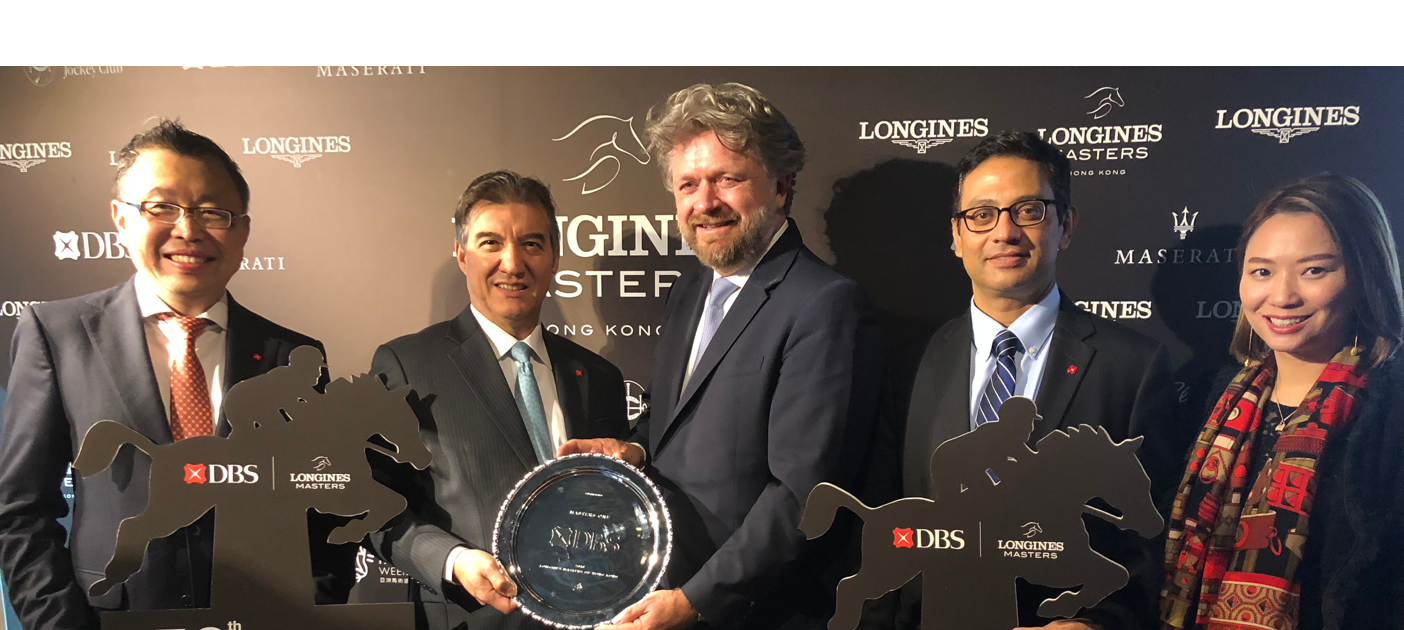 Celebrating DBS Hong Kong’s partnership with Longines Masters of Hong Kong are Januar Tjandra, North Asia Head of Private Banking (far left), Sebastian Paredes, CEO (second left), Christophe Ameeuw, CEO of EEM, Founder of the Longines Masters Series (centre), Ajay Mathur, Head of Consumer Banking Group & Wealth Management, Hong Kong (second right) and Nelly Tse, Head of DBS Treasures Private Client (far right).