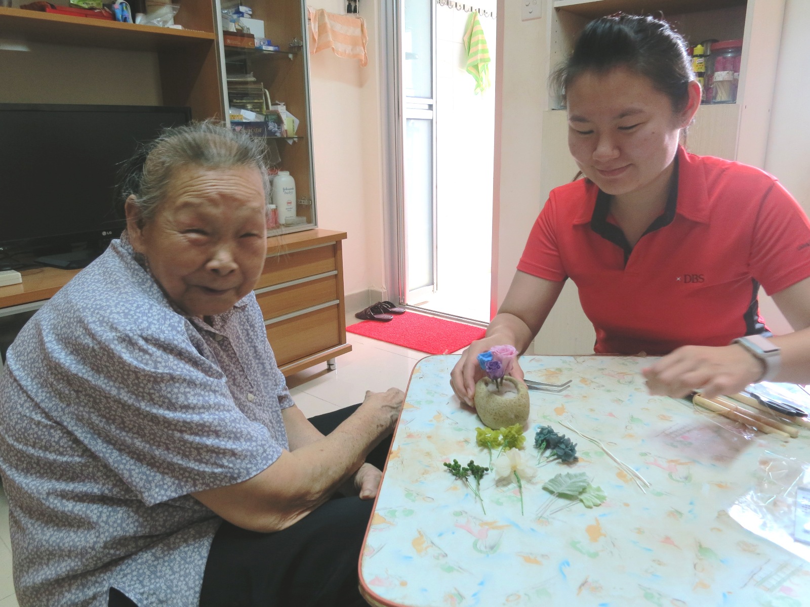 圖片二︰星展義工到與老友記一同製作色彩繽紛的保鮮花盆栽,為家中增添生氣,長者見到製成品亦笑容滿臉。