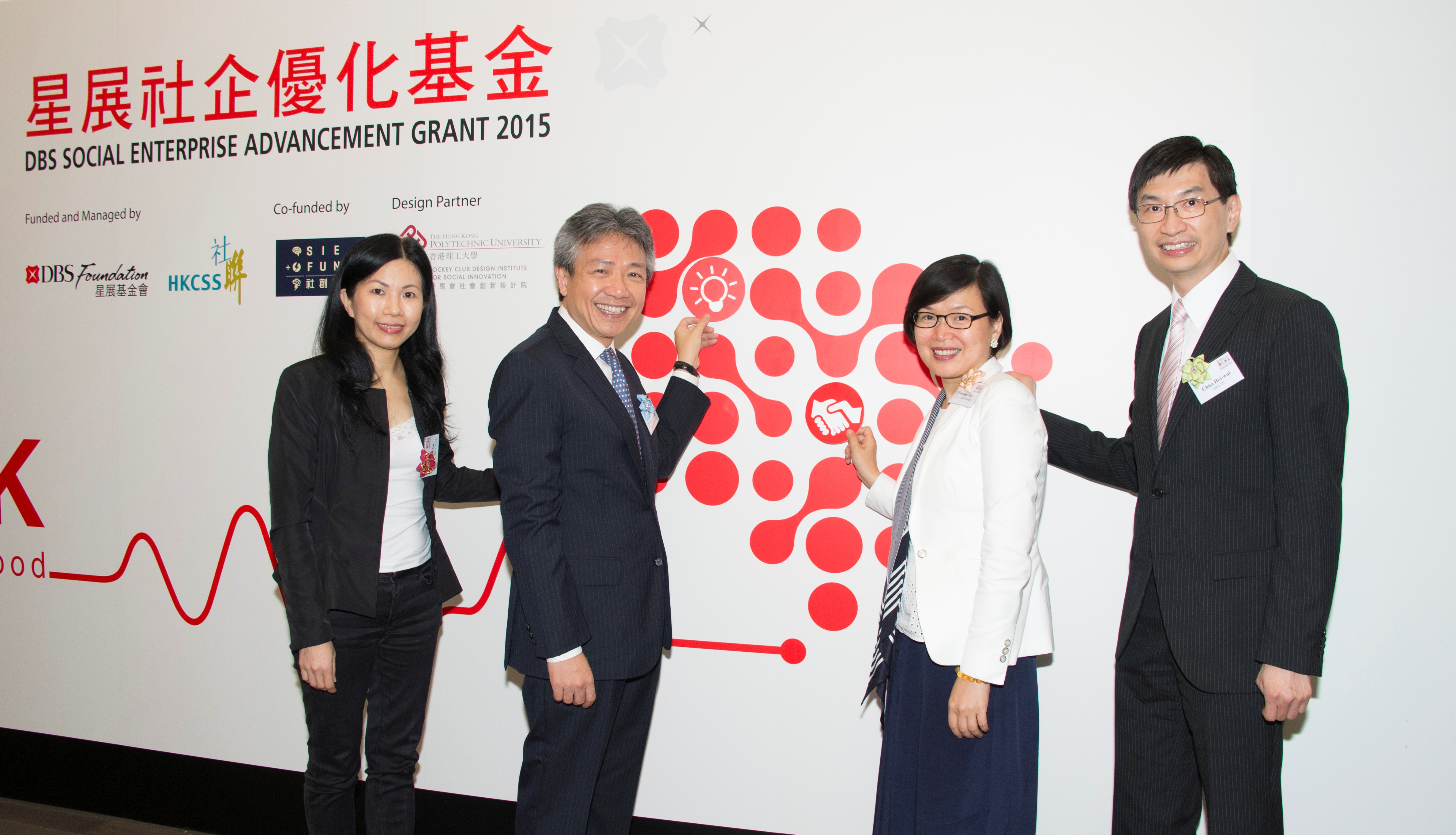 圖片一︰香港特別行政區民政事務局副局長許曉暉、扶貧委員會社會創新及創業發展基金專責小組主席張仁良校長、星展銀行(香港)有限公司執行董事兼集團推廣策略與傳訊部總監朱伊蓮,以及香港社會服務聯會行政總裁蔡海偉一同公布「星展社企優化基金」2015最後12強名單。