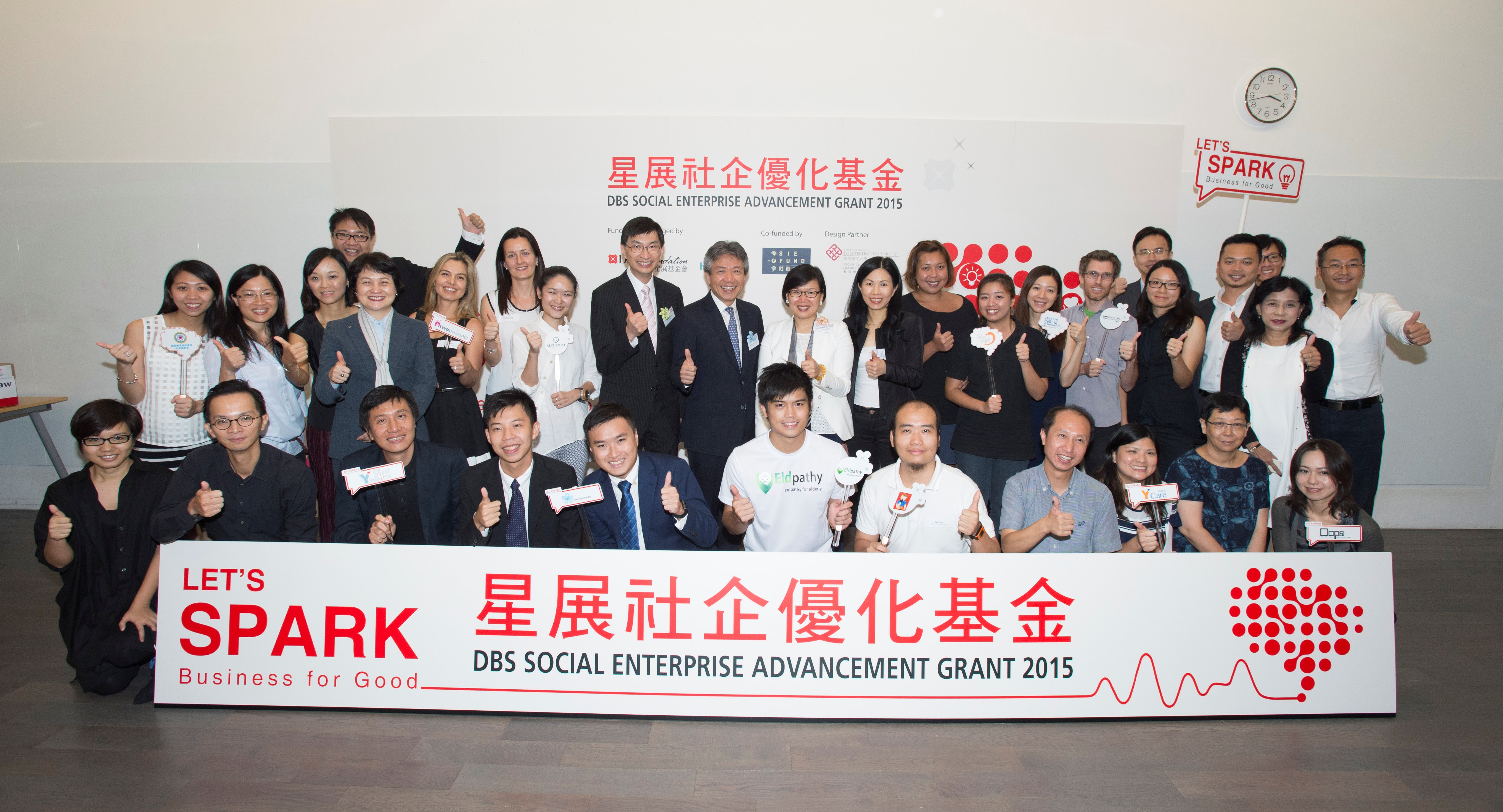 圖片二︰「星展社企優化基金」2015最後12強與一眾評審及主禮嘉賓合照。本屆有更多來自多個不同專業領域的社會創業家參與,其中包括建築師、科技人員、設計師、社工及年輕金融才俊等,證明社會自身已意識到各社會問題,各人均希望以自己的專業解決如在職貧窮、老年貧窮、跨代貧窮以至殘疾人士就業困難等社會問題。