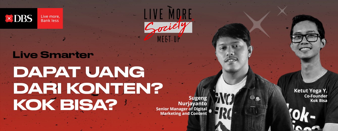 Punya mimpi bikin konten yang bisa menghasilkan uang? Simak cara agar bisa cuan lewat konten di DBS Live More Society Meet Up bersama konten kreator hebat.. Dari banyaknya konten-konten yang hadir, Ketut Yoga Yudistira (Co-Founder, Kok Bisa) dan Sugeng Nurjayanto (Digital Marketing & Content Manager, Bank DBS Indonesia) akan berbincang mengenai tren konten masa kini bagi para kreator dan calon kreator konten muda dan berada di industri yang menyajikan informasi hingga dapat dimonetisasi.-