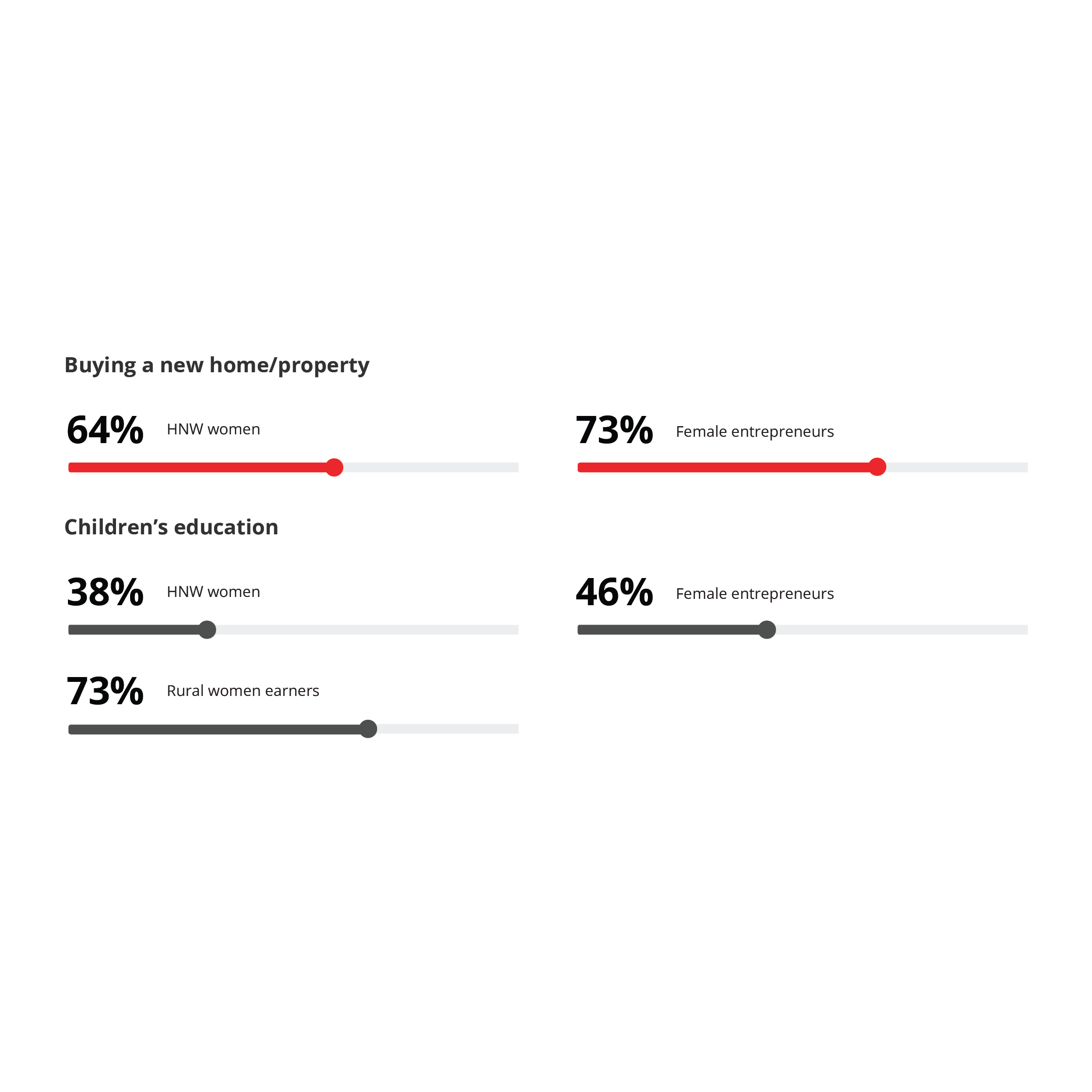 Across all age groups and income levels, 64% of HNW women and 73% of female entrepreneurs identify buying a new home or property as their primary life goal, highlighting a strong preference for tangible assets and an affinity with home ownership.