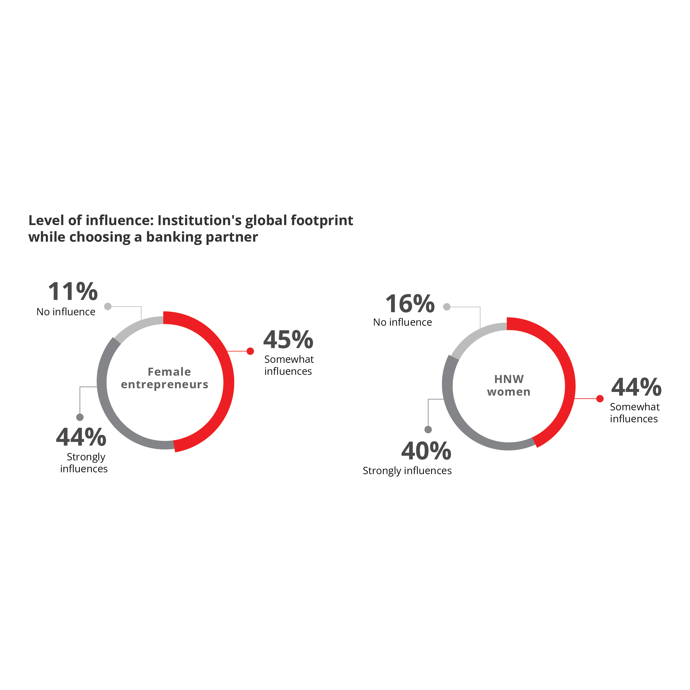 Among HNW women, 84% view an institution’s global footprint as an important factor in their choice. 81% of female entrepreneurs and 80% of HNW women surveyed already bank with global institutions.