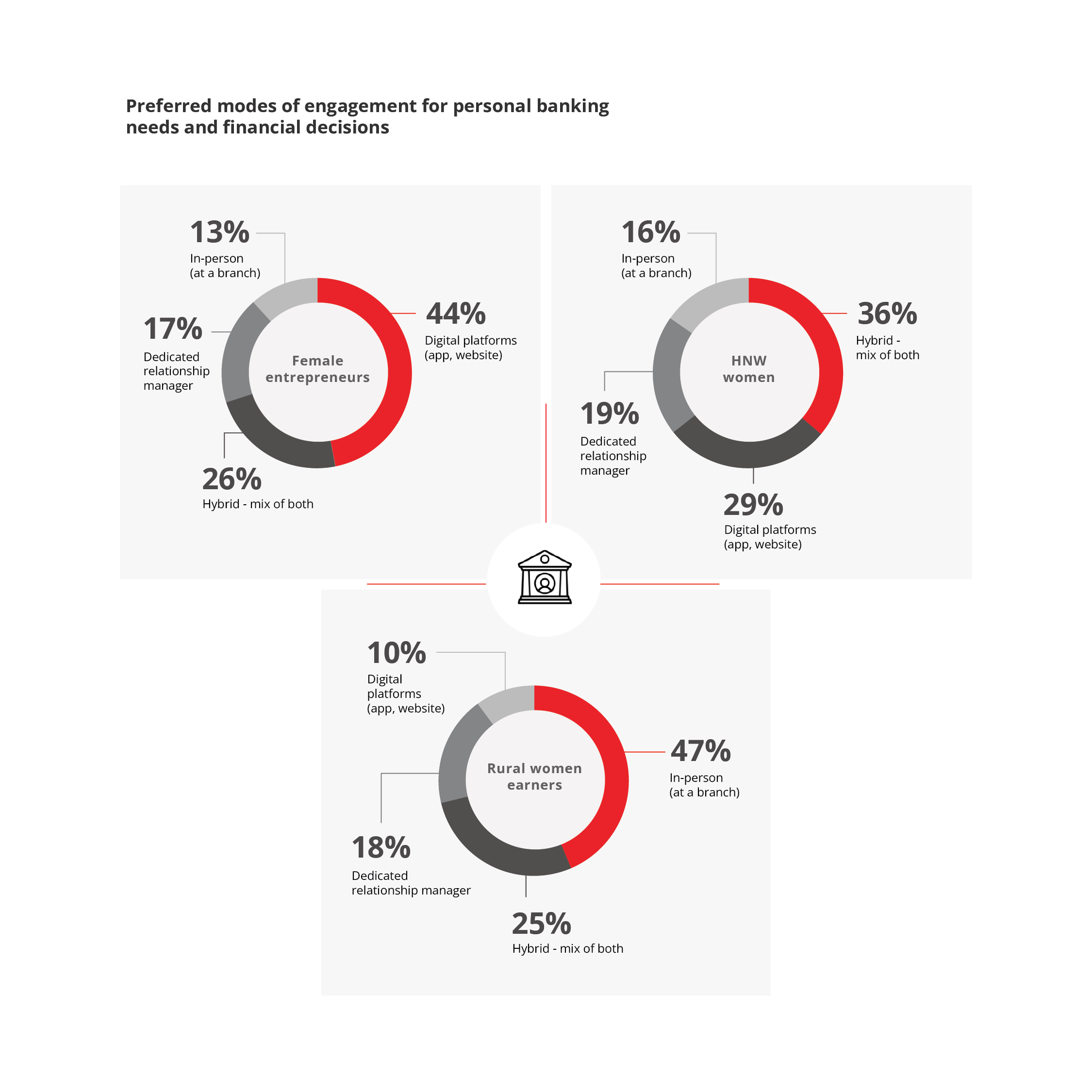 Digital platforms, including apps and websites, are the most preferred channels of engagement for female entrepreneurs (44%) and 29% of HNW women. HNW women tend to prefer a hybrid approach (36%), combining digital channels with in-person support.