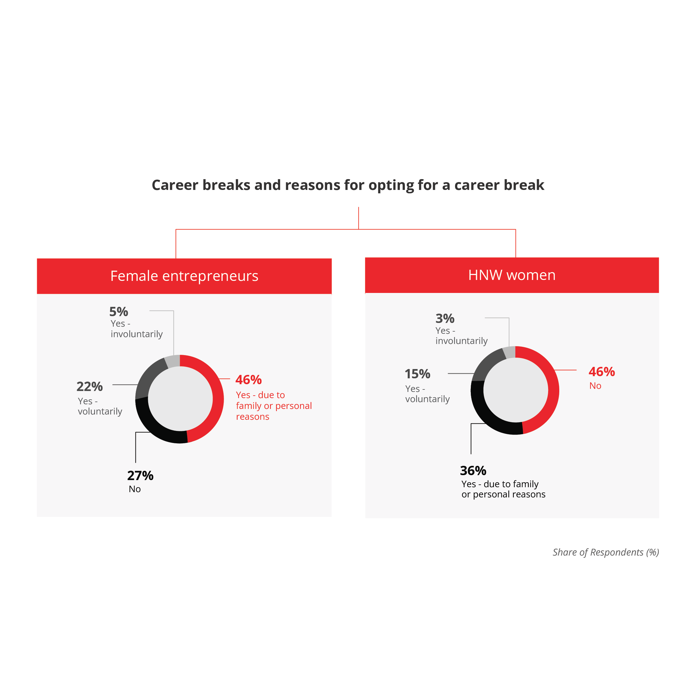 Female entrepreneurs report a higher incidence of extended breaks, with 46% taking breaks for family or personal reasons and 22% for voluntary reasons such as travel or upskilling. Among HNW women, the corresponding figures are lower, at 36% and 15% respectively.