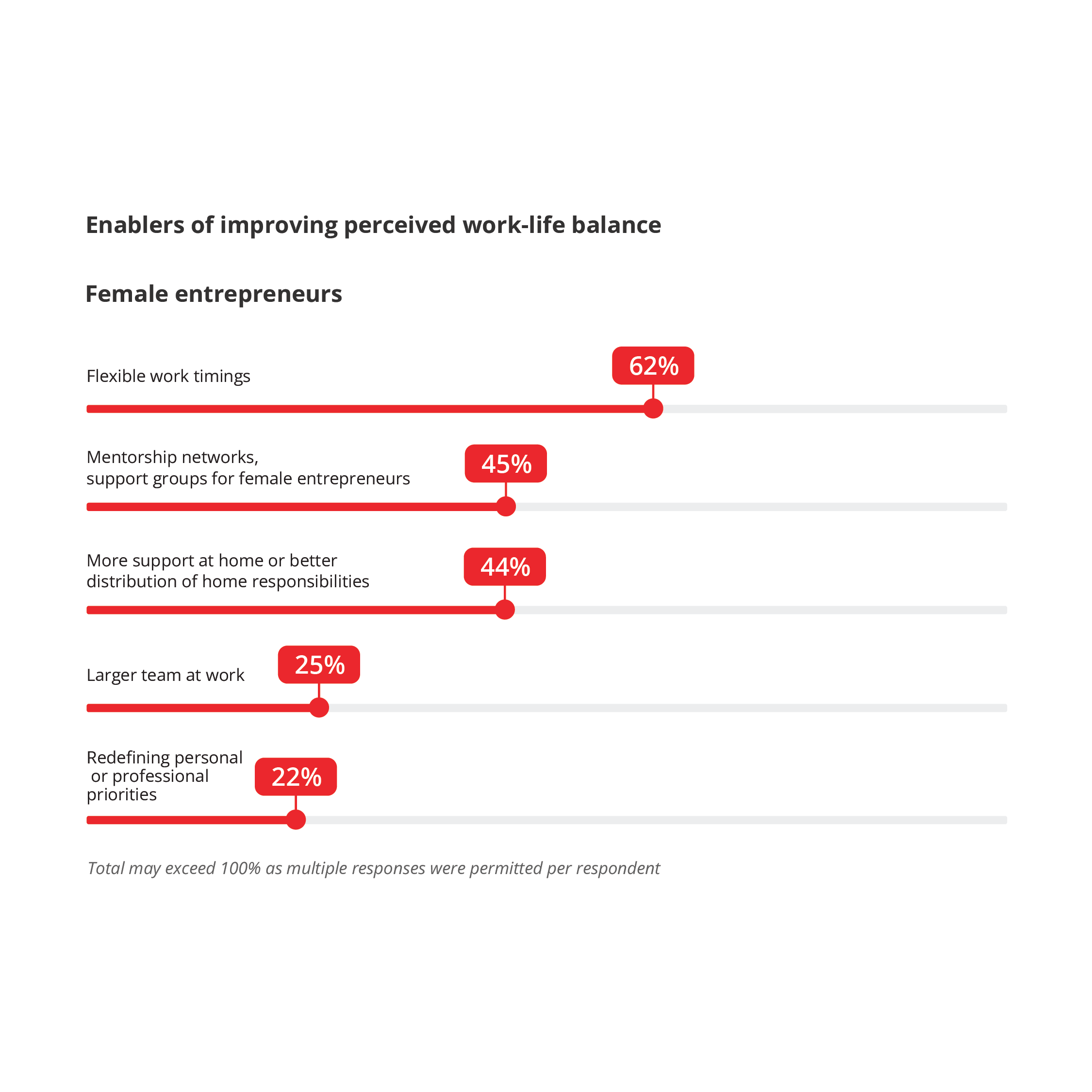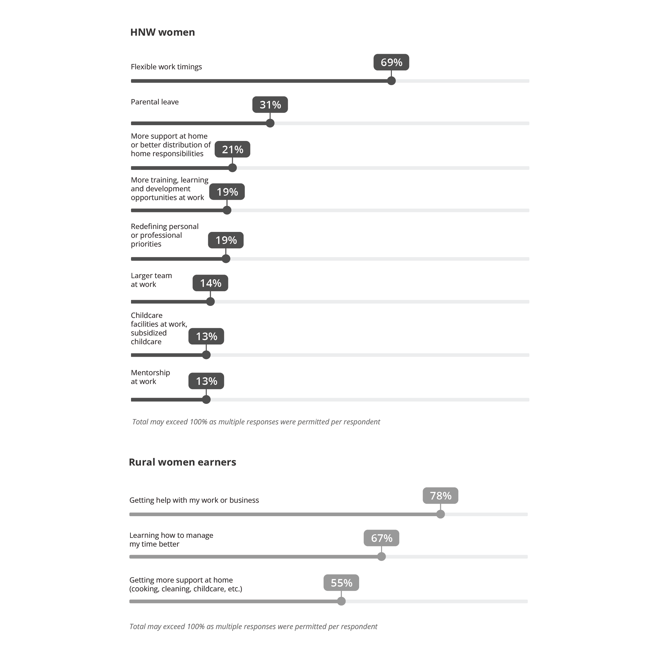 Across respondents, flexible working hours are the most widely cited enabler of improved work–life balance, valued by 69% of HNW women and 62% of female entrepreneurs.