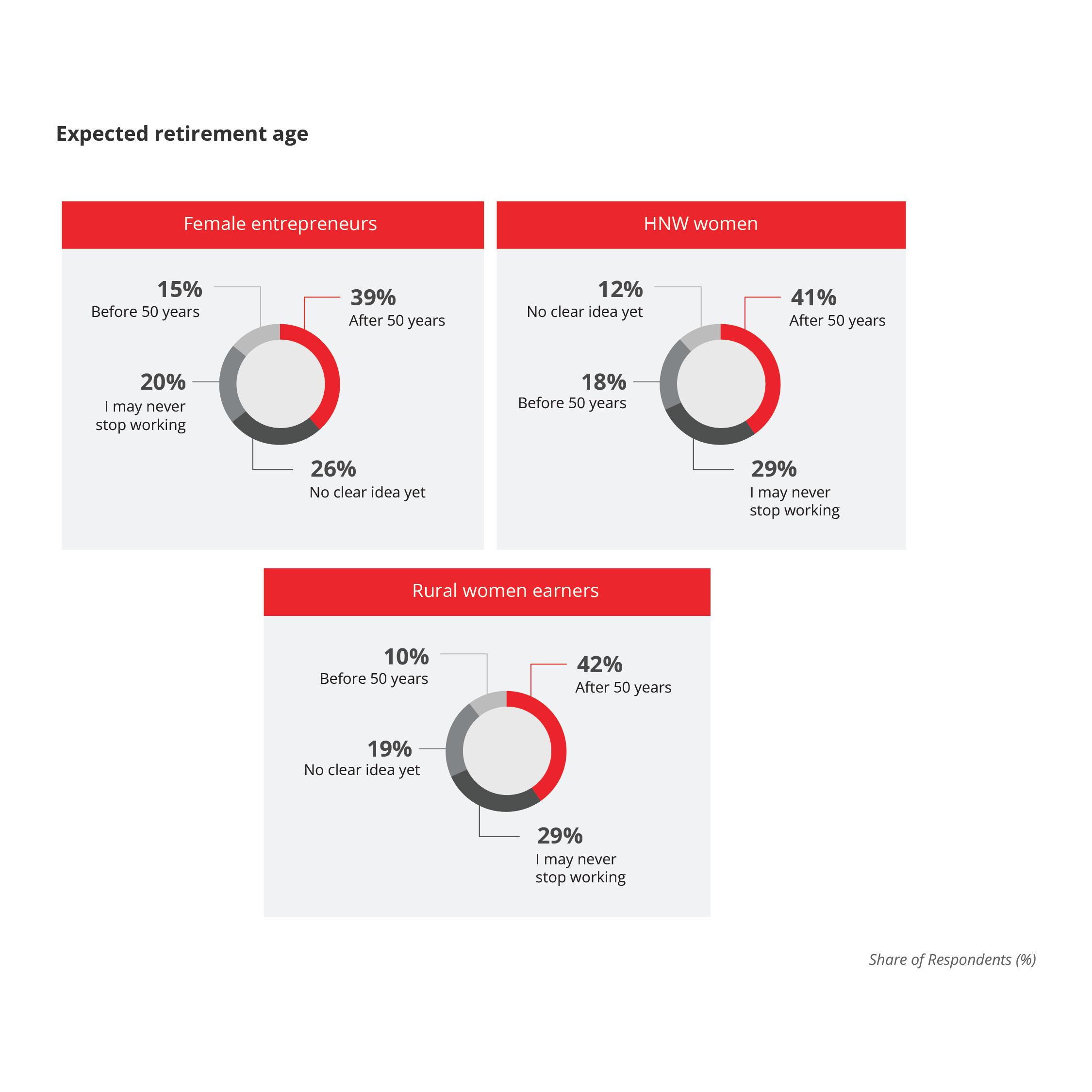 Among the female entrepreneurs surveyed, 39% expect to retire after the age of 50 years, 20% believe they may never fully retire, and 26% remain unsure. 41% of HNW women plan to retire after 50, 29% want to continue working and may not retire, while 12% are uncertain about their retirement age.