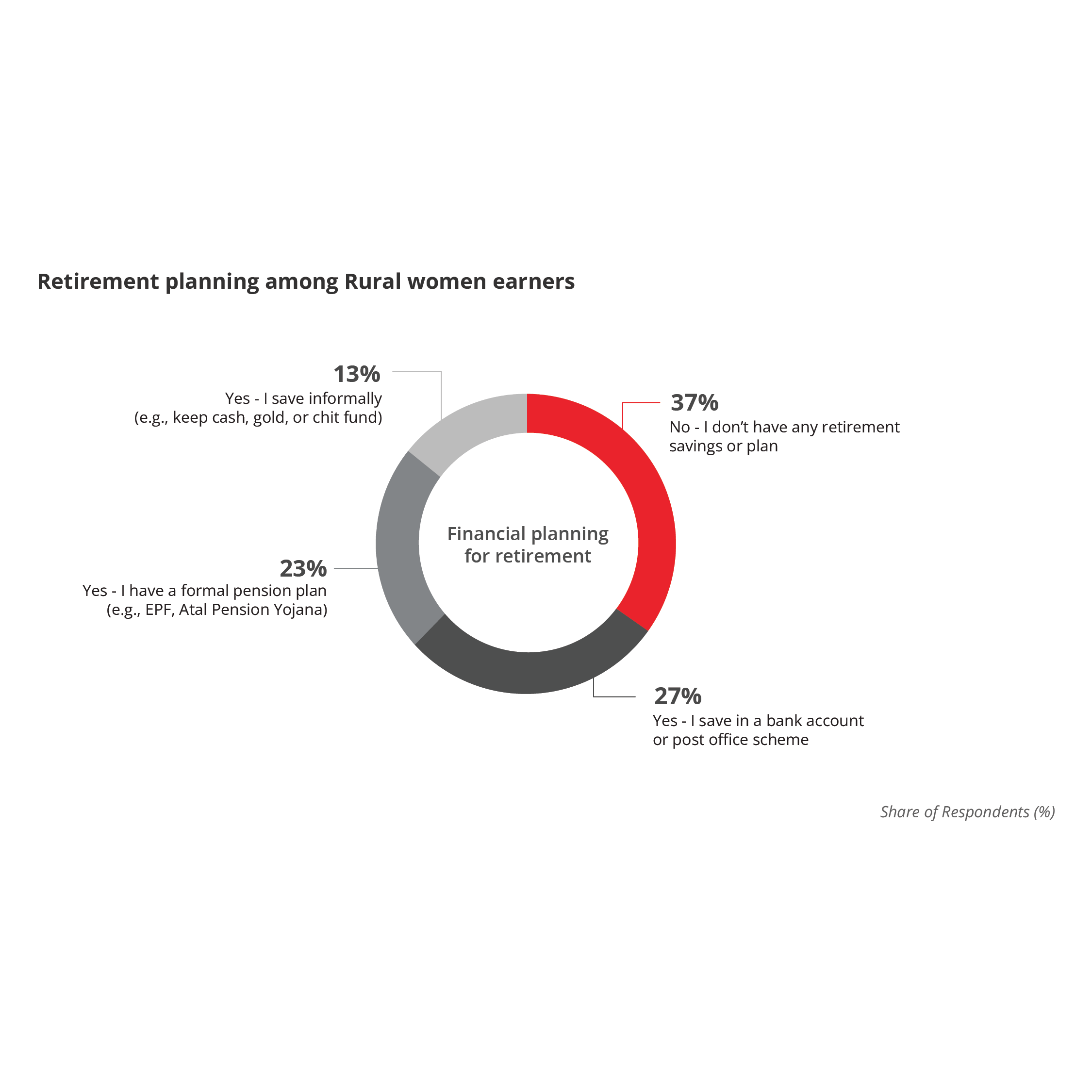 42% of rural women earners expect to retire after 50, 29% believe they will continue working indefinitely, and 19% were unsure about their retirement age. 37% of women in this cohort report having no long-term financial plan for retirement, while others rely on bank or post office savings (27%), formal pension schemes (23%), or informal instruments (13%).